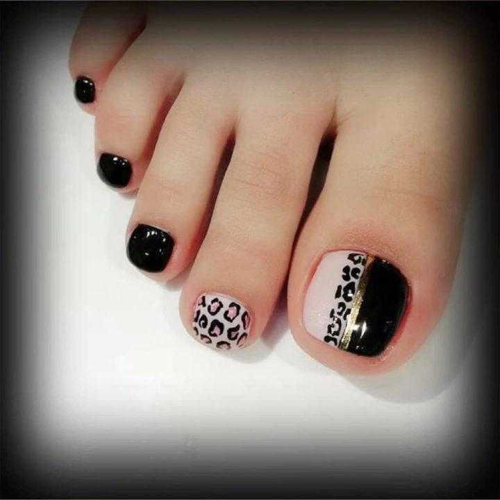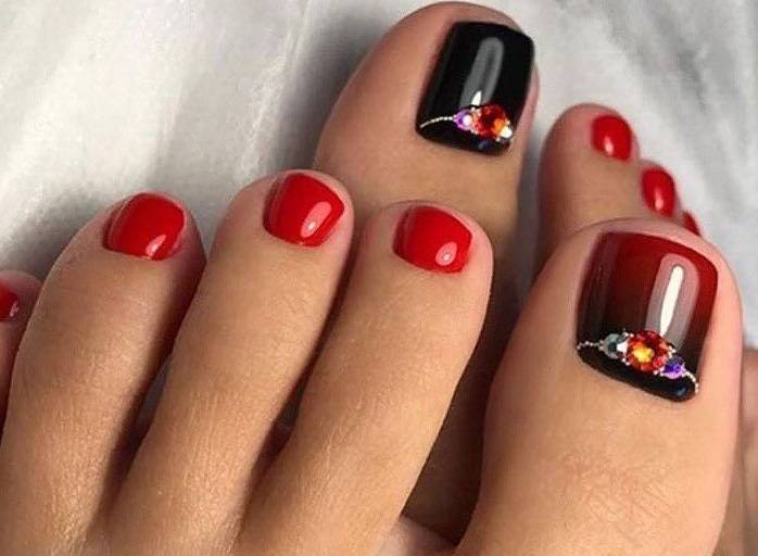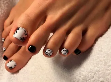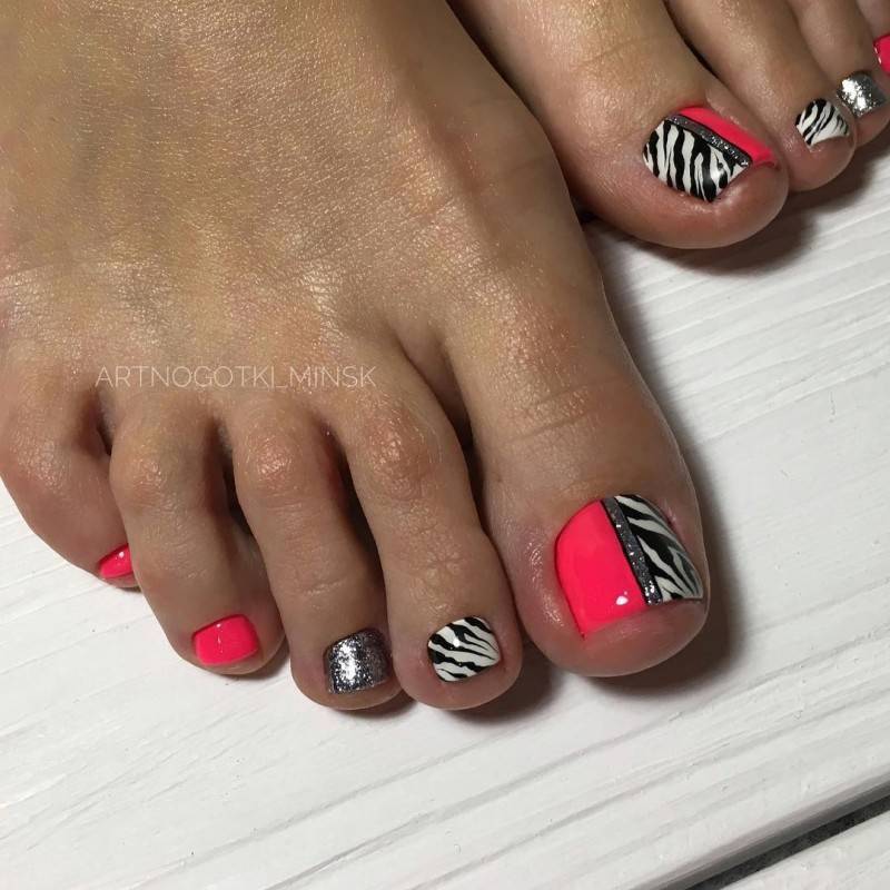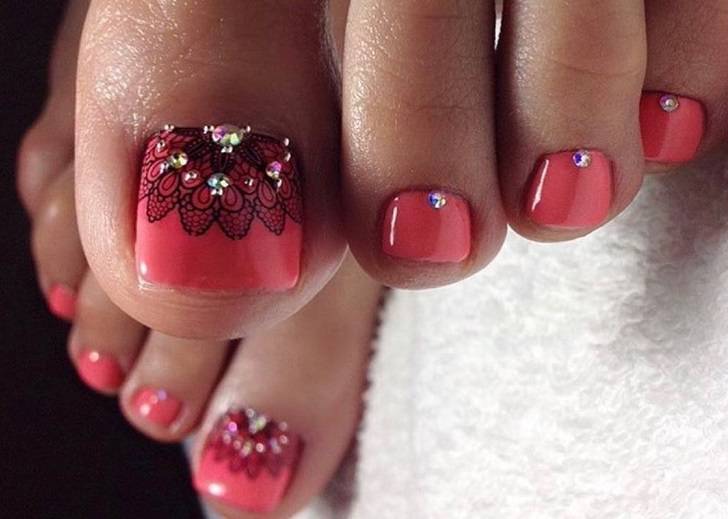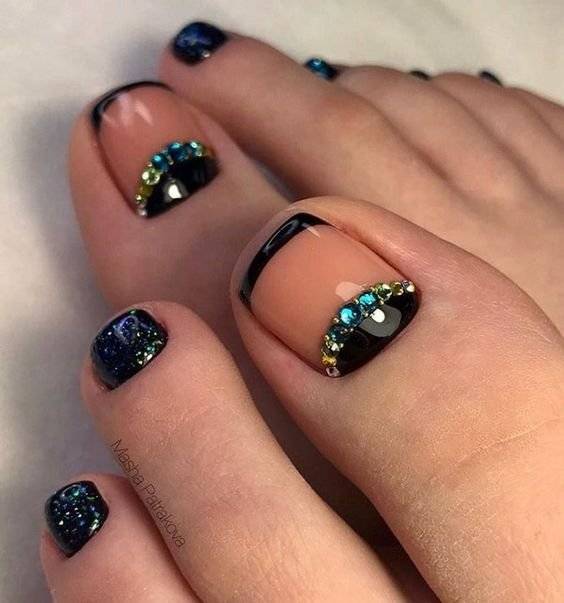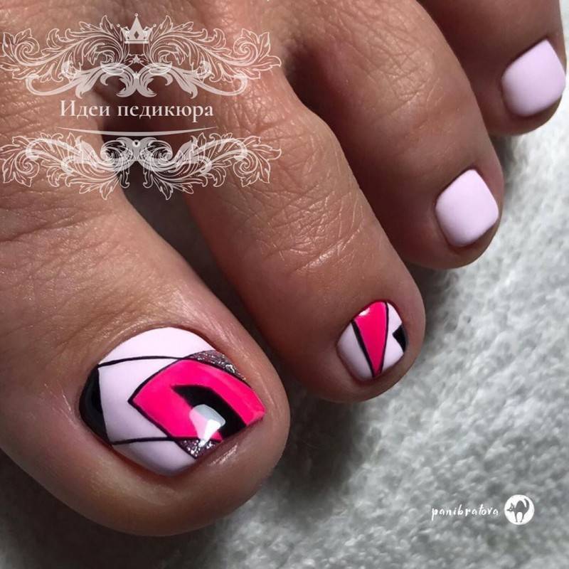 Добавление в дизайн педикюра чёрного цвета, позволяет максимально подчеркнуть тематику оформления, поэтому им можно смело прорисовывать детали рисунков, выделять границы между сочетаниями оттенков и использовать в небольших количествах для акцентирования части ногтевой пластины. Если вам кажется, что розово-чёрный дуэт смотрится немного мрачно, используйте при оформлении декор или оттенок, снижающий выраженную контрастность между покрытиями, например, белый. Не менее эффектно смотрятся в таком сочетании покрытия с содержанием блестящих частиц.