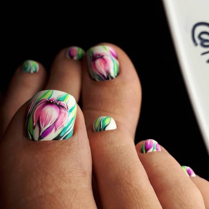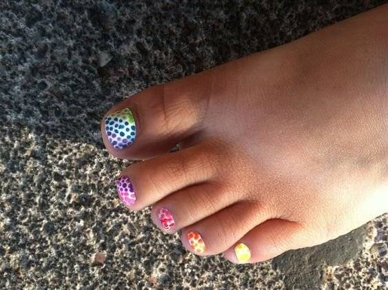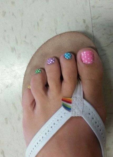 В этом примере пальцы ног сначала окрашиваются в глянцевый, белый цвет, затем в цвета радуги добавляются слегка неправильные точки. Эта яркая идея для педикюра отлично будет дополнять вашу одежду.