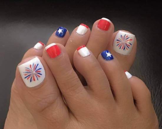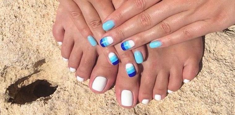 Актуальными цветами является синий и голубой цвет, которые прекрасно подходят под оттенок моря, неба и будут весьма актуально выглядеть на морском отдыхе. Эти цвета хорошо расширяют ногтевую пластину и позволяют создать стильный педикюр. Кстати, допускается разнообразная цветовая гамма, что позволит выбирать между теплым и холодным подтоном.