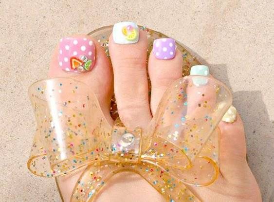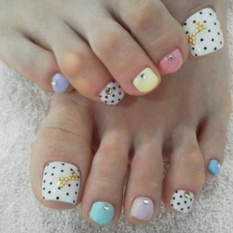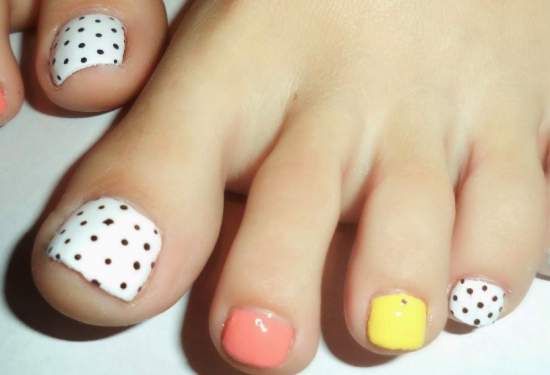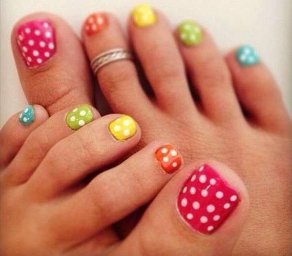 Эти милые и легкие ногти имеют сплошной цвет фона и идеально расположенный белый горошек. Цвета расположены в порядке радуги для причудливого вида. Также этот педикюр легко будет сделать в домашних условиях. Свежесть этого дизайна будет хорошо смотреться на всех, особенно подростках.