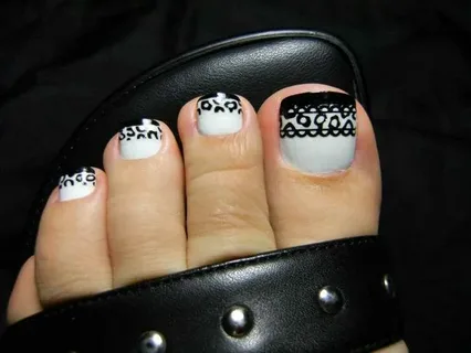 Рисунок в виде фрагментов надписи на черно-белом педикюре. Пара ногтей оформляется узором из букв, остальные пластины покрываются черным лаком. Несмотря на классические тона, педикюр выглядит очень свежо.
