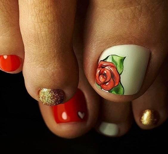 На этом симпатичном дизайне ногтей с цветочным акцентированным большим пальцем изображена классическая роза. У другого пальца есть крошечное сердце на красном фоне. Остальные ногти имеют смесь золотого, белого и красного цветов.