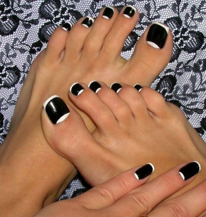 Использование однотонных лаков разной фактуры (сочетание матового и глянца). Особенно красиво выглядит в черном, темно-синем и шоколадном цвете. Такая техника выигрышно смотрится на французском педикюре.