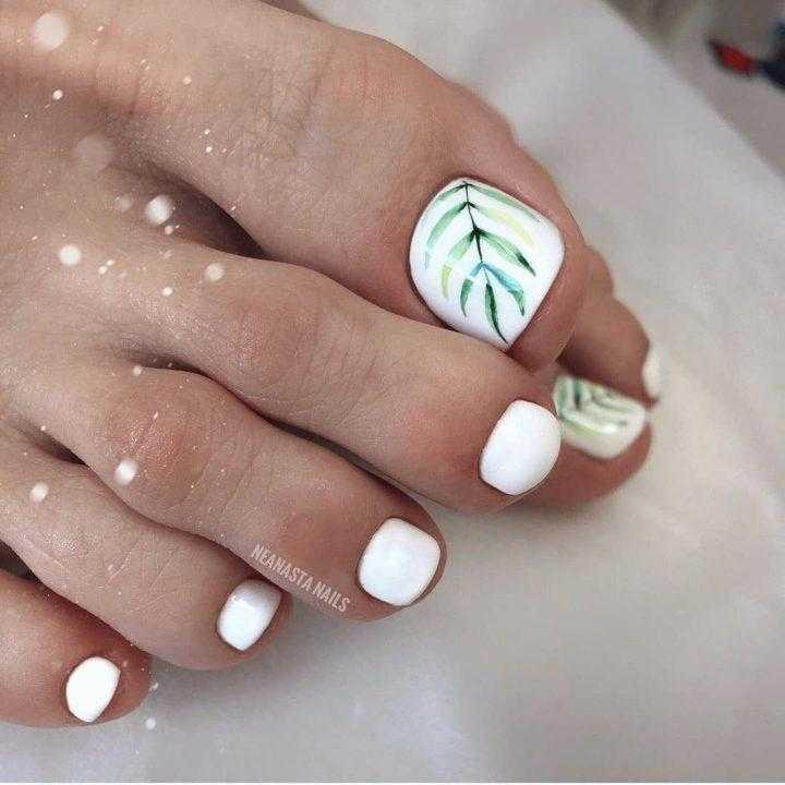 Матовый папоротник. Зеленый травяной цвет, прежде всего, выбирают в качестве летнего педикюра. Матовая текстура замечательно сочетается с данным оттенком, а рисунок папоротника удачно вписывается в белое покрытие на большом пальце.