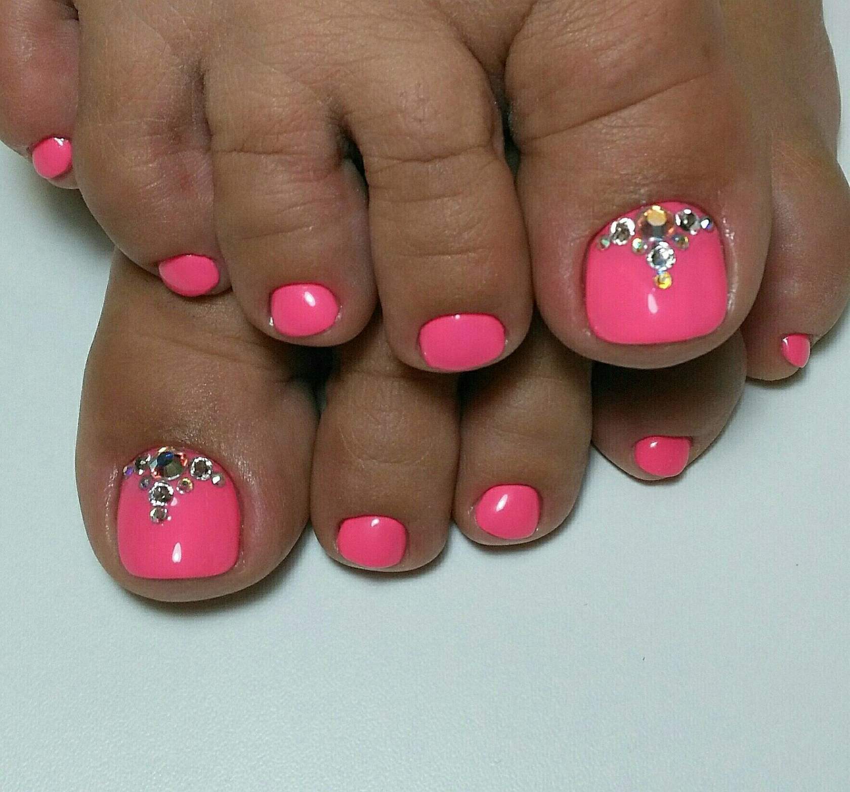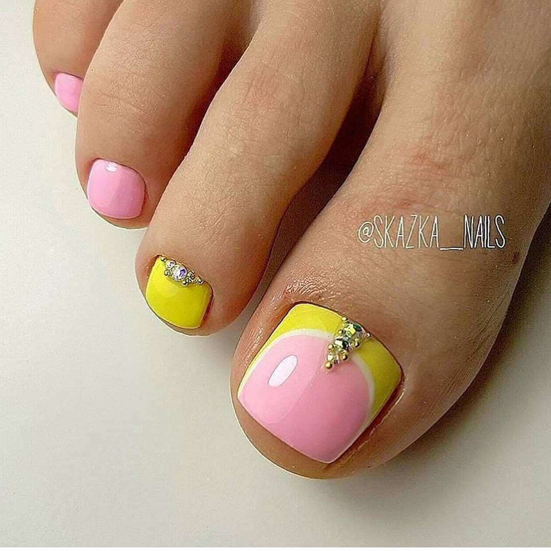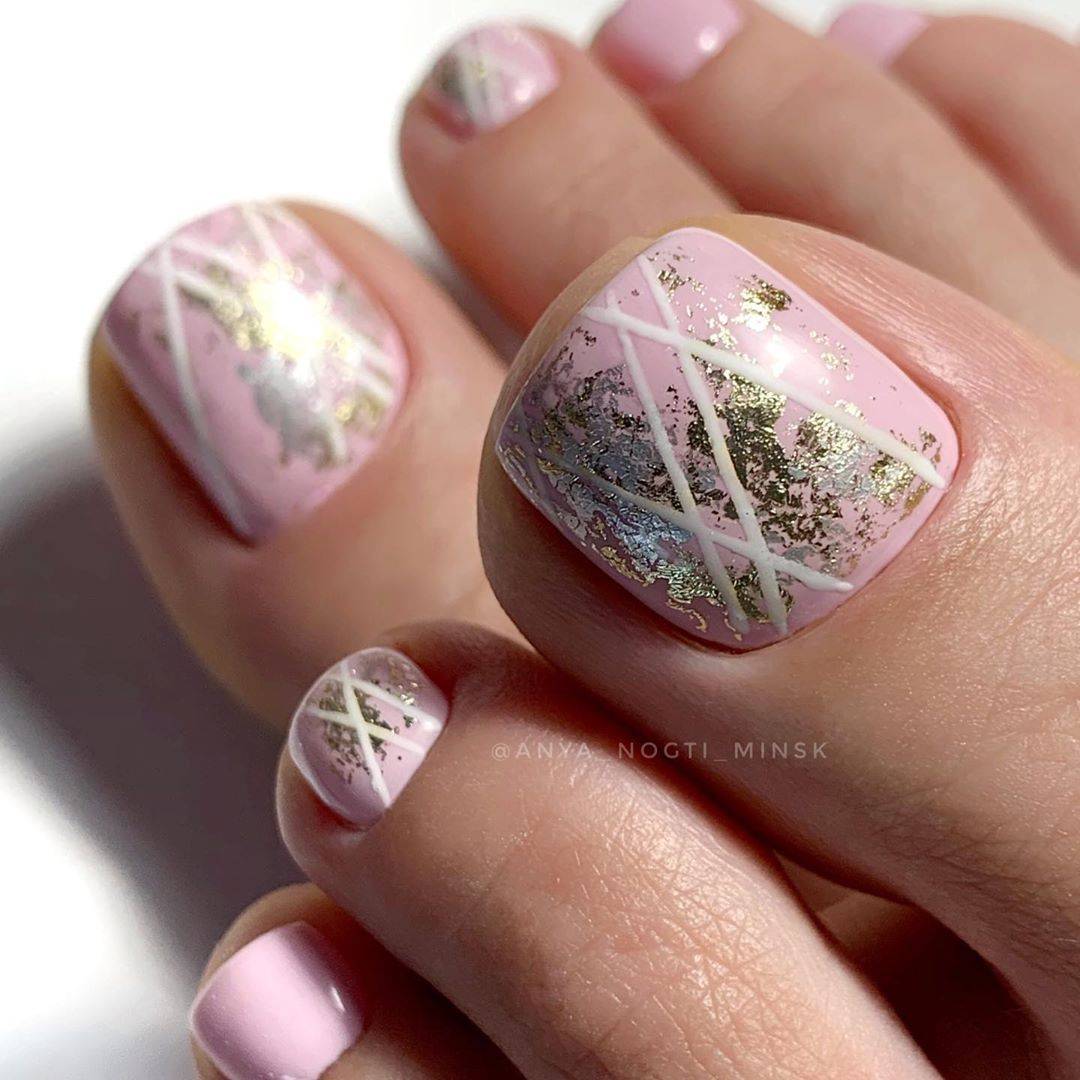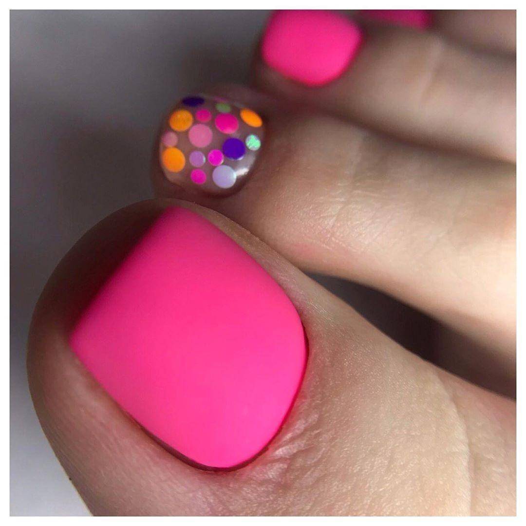 Эта идея для педикюра сочетает в себе блестящий опалесцирующий розовый на большом пальце и простые розовые ногти. Этот дизайн для тех, кто хочет похвастаться уникальным педикюром на своих ногах.
