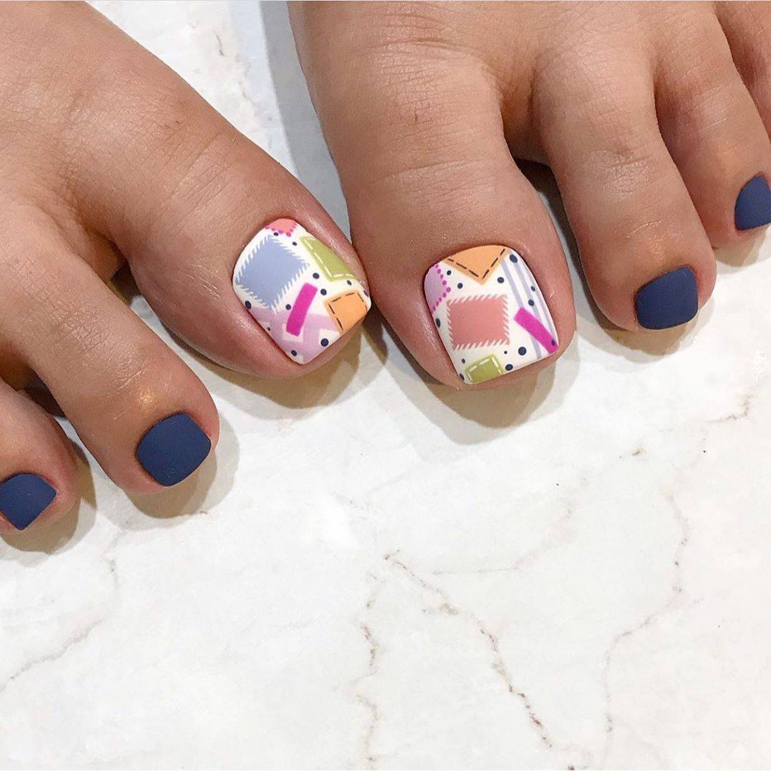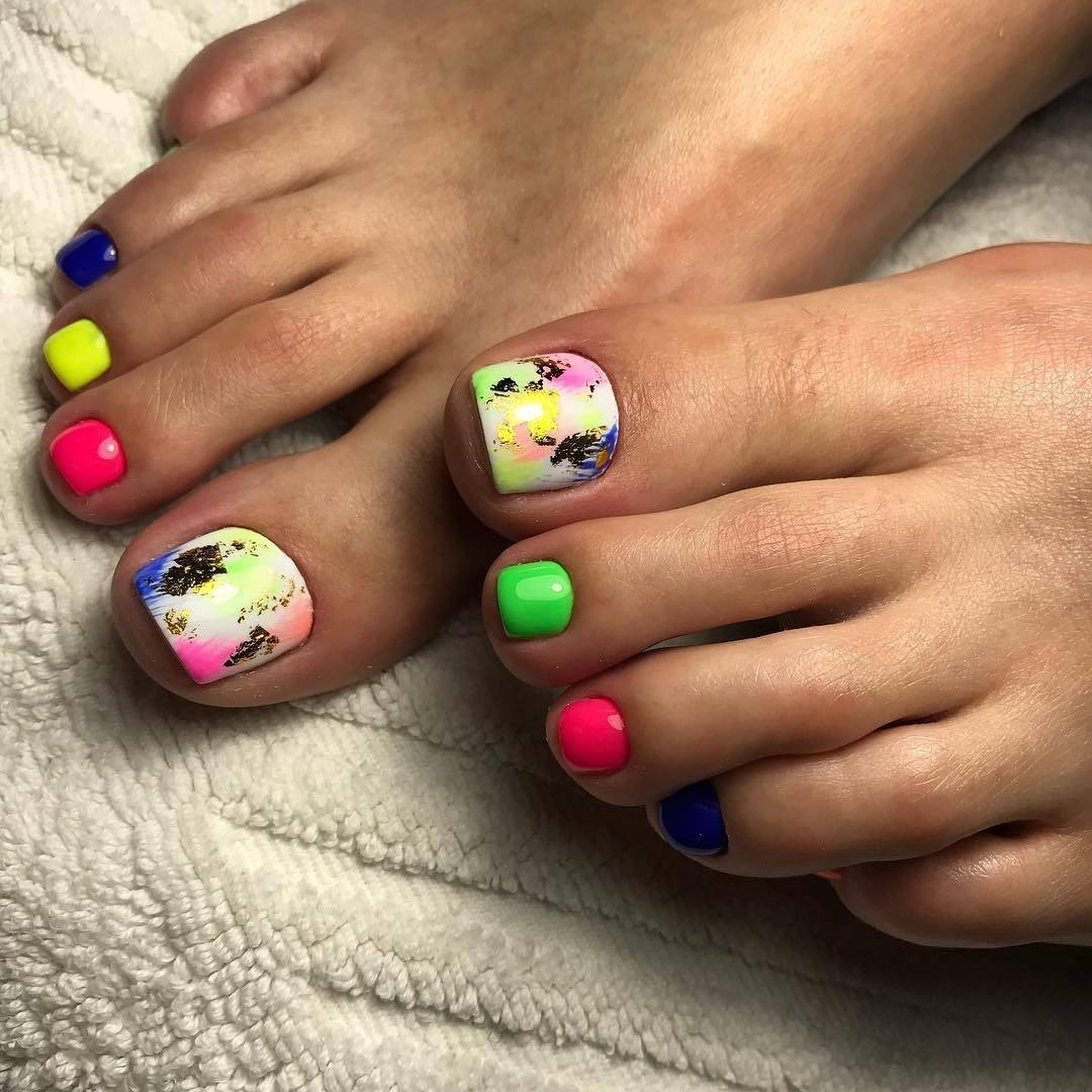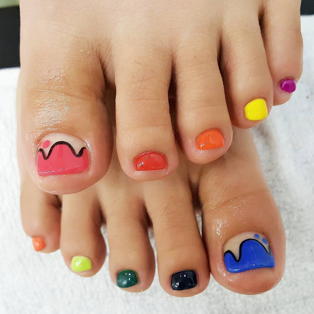 Эти милые и легкие ногти имеют сплошной цвет фона и идеально расположенный белый горошек. Цвета расположены в порядке радуги для причудливого вида. Также этот педикюр легко будет сделать в домашних условиях. Свежесть этого дизайна будет хорошо смотреться на всех, особенно подростках.