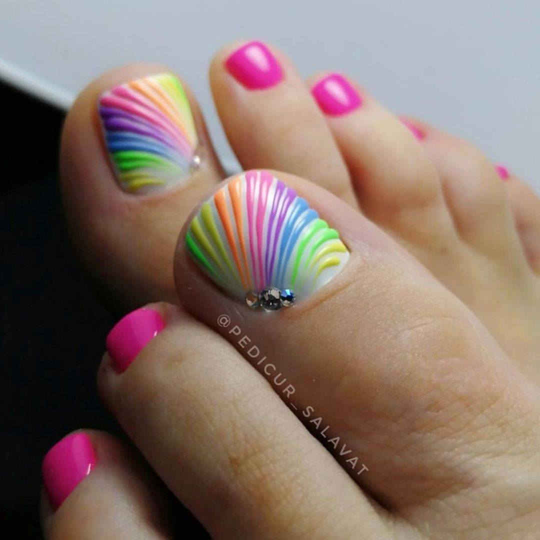 В этом примере пальцы ног сначала окрашиваются в глянцевый, белый цвет, затем в цвета радуги добавляются слегка неправильные точки. Эта яркая идея для педикюра отлично будет дополнять вашу одежду.