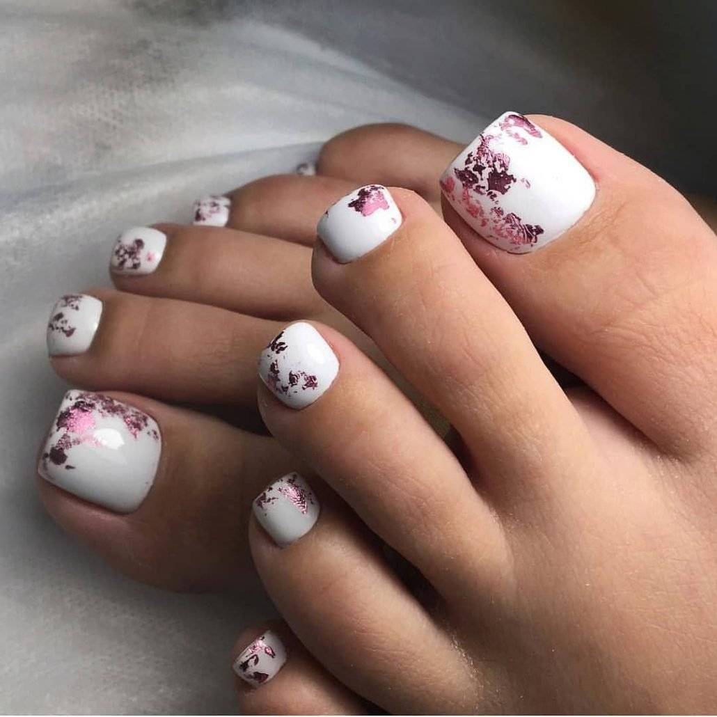 Сочетание розового с белым считается наиболее распространённым дуэтом в дизайне ногтей. Однако, для создания гармоничной композиции, дизайнеры советуют придерживаться некоторых правил. Если в педикюре используется яркий розовый оттенок, то дополнение белого следует свести к минимуму. При выполнении педикюра в светлой гамме основного покрытия, допускается его акцентное использование. Белое покрытие может выделять один ноготь на большом пальце и дополнительно украшаться декором из страз, блёстками глиттера либо рисунком. Также очень красиво смотрится розовый педикюр с белыми деталями, которые немного разбавят однотонность основного цвета и сделают дизайн более нежным.