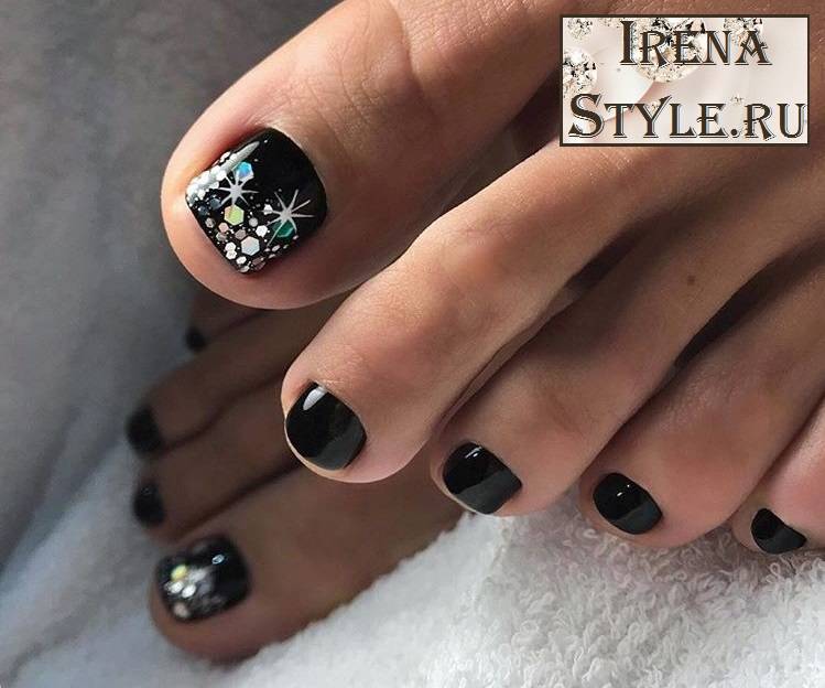 Добавление в дизайн педикюра чёрного цвета, позволяет максимально подчеркнуть тематику оформления, поэтому им можно смело прорисовывать детали рисунков, выделять границы между сочетаниями оттенков и использовать в небольших количествах для акцентирования части ногтевой пластины. Если вам кажется, что розово-чёрный дуэт смотрится немного мрачно, используйте при оформлении декор или оттенок, снижающий выраженную контрастность между покрытиями, например, белый. Не менее эффектно смотрятся в таком сочетании покрытия с содержанием блестящих частиц.
