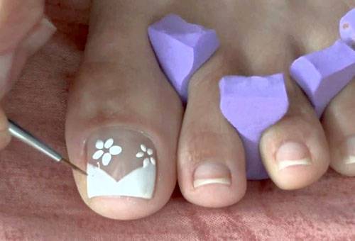 Беспроигрышный вариант педикюра – это френч. Аккуратные полоски наносятся на ногтевые пластины горизонтально. По желанию можно добавить элементы абстракции, узоры или другие рисунки. Различные оттенки смешиваются с помощью иглы, а изображения выполняются тонкой кисточкой. Сначала наносится база, потом цвет в 2 слоя. О сушке забывать нельзя. После каждого слоя помещаем пальчики в лампу. Запечатывание торца делать обязательно. Такая работа является кропотливой и требующей терпения. Но результат нередко превосходит все ожидания.
