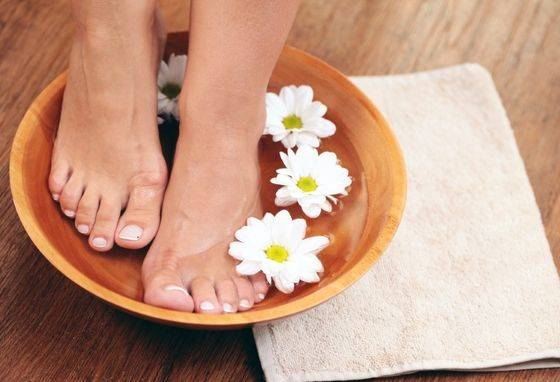- Для ног сделайте ванночку. Для этого нужно в миску теплой воды добавить по одной столовой ложке миндального и оливкового масла. Можно пользоваться эфирными маслами, морской солью и травяными сборами. Ноги опустите в ванночку на 7 минут, затем просушите чистым полотенцем.