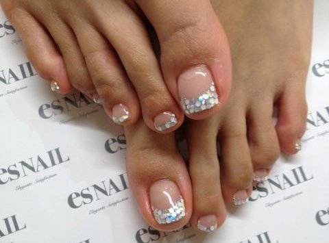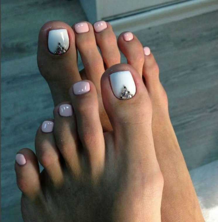 Дизайн френч на ногах со стразами пользуется большой популярностью у женщин: