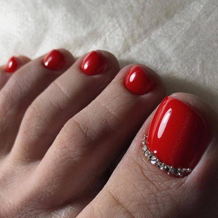 Чтобы достичь наивысшей гармонии и целостности образа, подбирайте палитру стразов и лака для ногтей, перекликающуюся с маникюром или одеждой. Это могут быть как контрастные решения, так и дополняющие варианты. Педикюр со стразами отлично подойдет для романтического вечера, шумной вечеринки и праздника.