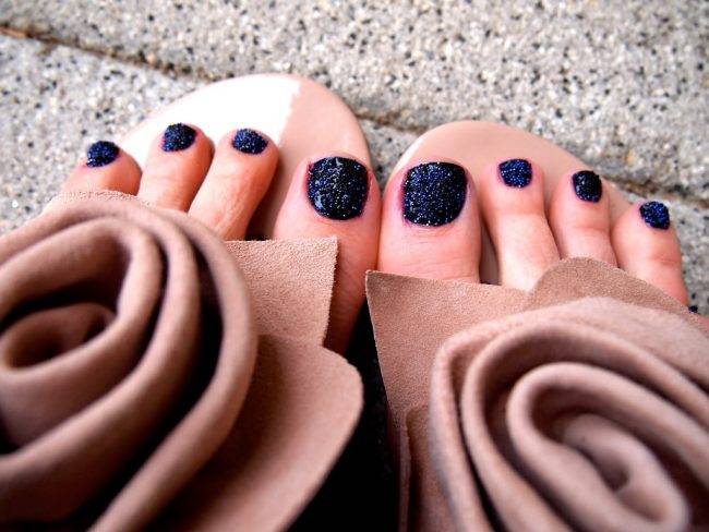 Перед тем, как наносить лак, необходимо сделать легкий пилинг стопы и массаж ног