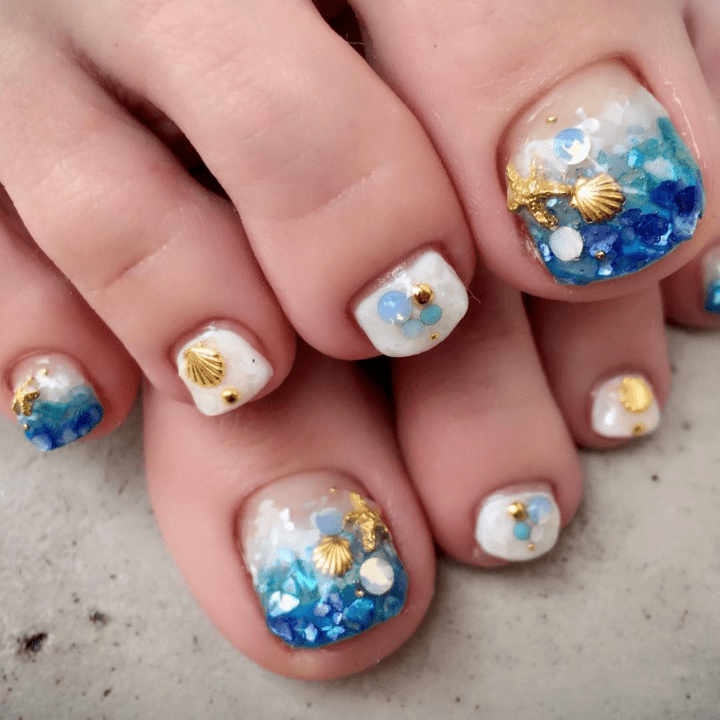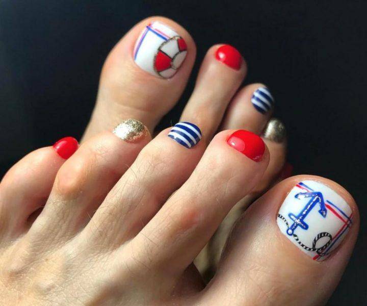 Здесь как и с синими и красными цветами есть свои виды. Классический педикюр может быть декоративно-золотым, иметь пастельные тона, белые и иметь множество других вариаций.
