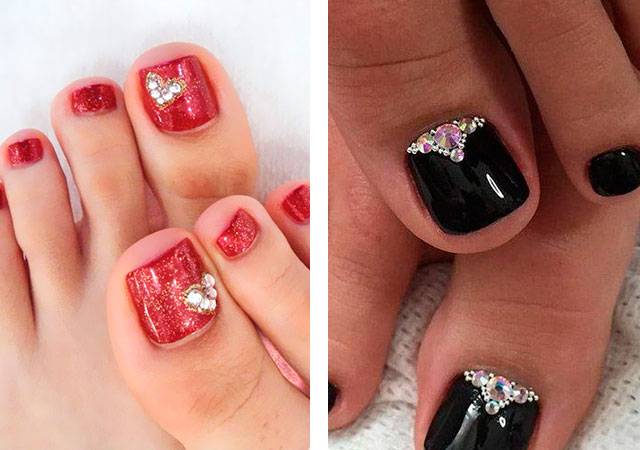 Педикюр с ними будет очень стильным, но важно расположение украшения. Оно не должно полностью покрывать ноготь, а быть только на определенных частях, создавая тем самым узор