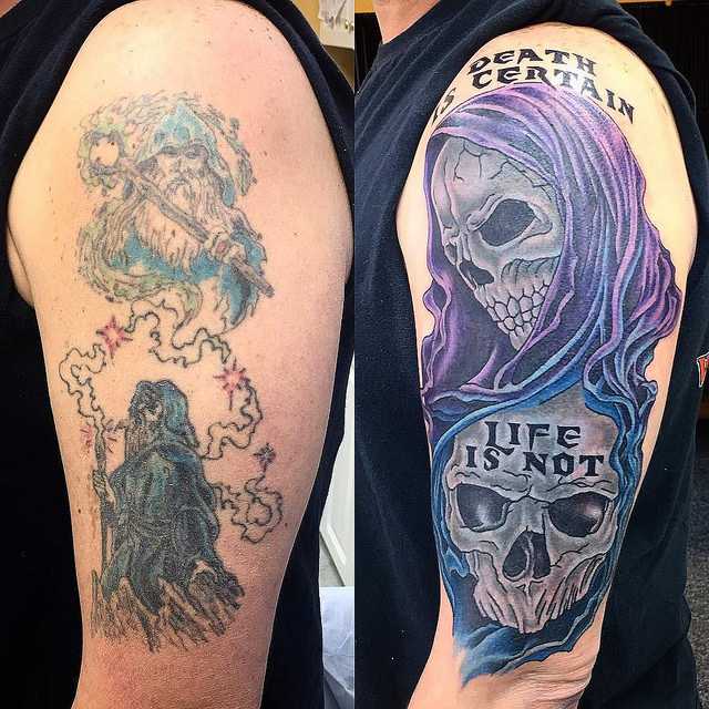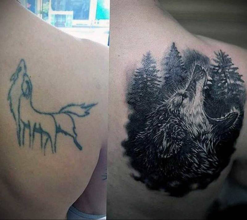 Также изменить надоевшую татуировку можно, если «доработать» ее. Добавляются новые элементы, изображение обрастает деталями, цветовым обновлением, теневыми эффектами, ретушью. Получается совершенно новая татуировка. В этом случае прорабатывать старый рисунок нет необходимости, так как работа выполняется вокруг него.