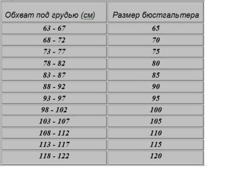 | Размер бюстгальтера | Подгрудный объем (см) | Грудной объем (см) |