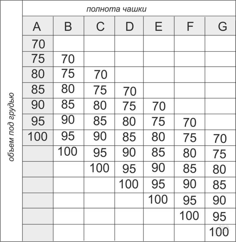Необходимо от объема груди отнять объем под грудью и полученный результат оценить по специальной шкале, которая представлена в таблице ниже: