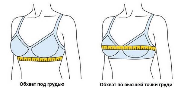 Первым делом измеряется охват под грудью, потом охват самой груди.