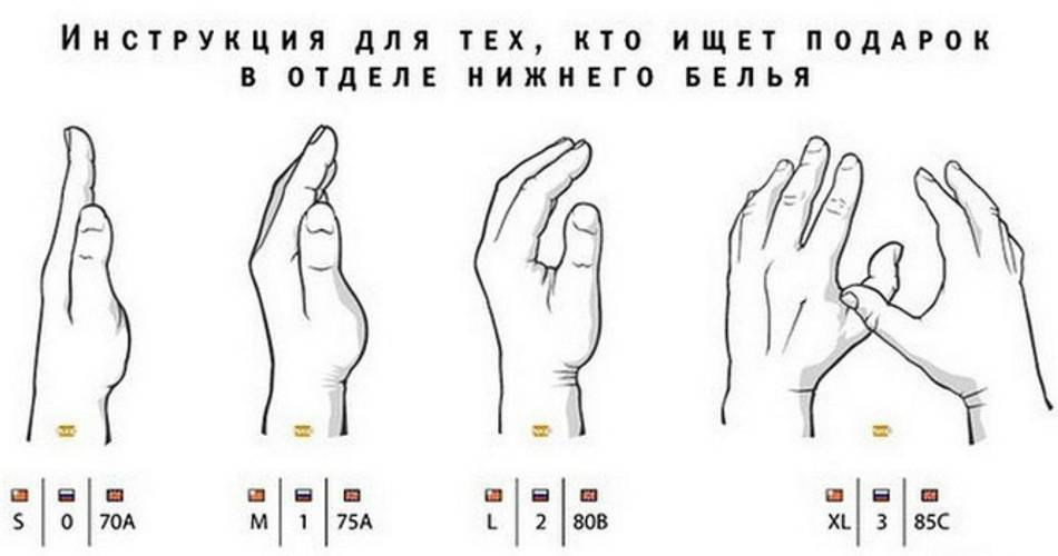 - Вариант для маленькой груди: заранее измерь ладонь от запястья до кончика среднего пальца, обхвати бюст девушки и посмотри, сколько сантиметров ладони занимает выпуклость. Это даст более точные данные для подбора нужной вещи.