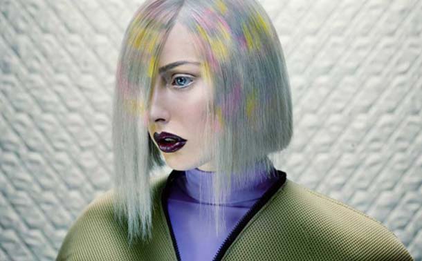 Техника окрашивания предполагает ярко-кислотные цвета и обязательный градиент. Идеальный вариант прически для пикселирования – стрижка с асимметрией. Она лучше всего подходит для создания эффектного образа футуристической девушки, первоначально задуманного испанскими стилистами.
