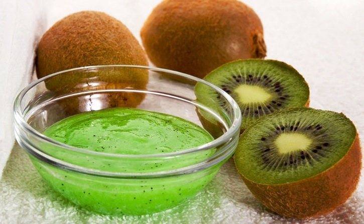 - «Универсальный из киви». Возьмите половинку спелого киви, пюрируйте его блендером или разомните вилкой. Добавьте 1 чайную ложку манки, чтобы сделать состав гуще и избежать стекания по лицу. Время воздействия: 3 минуты.