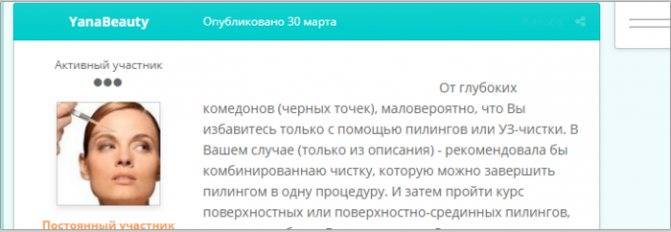Не верит в избавление от черных точек с помощью пилингов косметолог в следующем отзыве. Говорит, что в этом случае лучше сделать комбинированную чистку в салоне, а пилингом ее завершить. И только потом пройти полноценный курс пилингов разного действия: поверхностных, поверхностно-срединных.