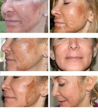 - Появление белых пигментных пятен на лице («мраморная кожа») — такое осложнение характерно после глубокого воздействия на рубцы и шрамы. Это говорит о гибели меланоцитов (клеток, вырабатывающих меланин, кожный пигмент). Частично скорректировать проблему сможет курс поверхностных эксфолиаций фруктовыми кислотами.