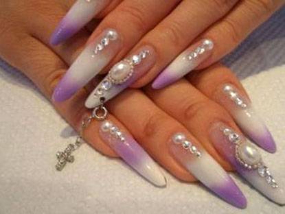 Более нежный и утончённый дизайн требует соответствующих скромных и нежных украшений. А для насыщенного дизайна с изобилием декора можно подобрать броские большие подвески с цепочками. Свадебный маникюр лучше украсить нежным элегантным украшением под стиль всего образа невесты. Если на маникюре не много декора из стразов, бисера бусин и фольги, то скромное украшение в виде гвоздика или подвески с камнем будет как нельзя кстати. Ноготки невесты с обильным декором нужно украсить более броским и сложным украшением. Подойдут подвески с цепочками, камнями и бусинами. Выбирая нейл-арт и пирсинг для ногтей к свадебному маникюру, не забывайте учитывать стиль невесты и весь её образ. Модный дизайн ногтей эйдж также хорошо комбинируется с пирсингом. Дизайн «Эйдж» – это особый вид маникюра, при котором наращенным ногтям помимо заострённого в форме буквы «V» кончика придаётся двухгранная форма с изломом по центральной оси ногтя. В этом случае пирсинг крепится на одну из граней ногтевой пластины.