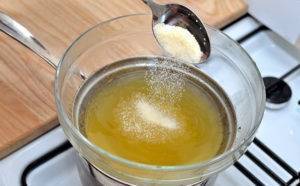 Для создания такой маски нужно закипятить воду в чайнике и дать ей остыть. Вода должна быть теплой, но не кипятком. В отдельную емкость насыпается 1 ст. ложка желатина, добавляется туда 3 ст. ложки воды. Смесь хорошо перемешивается. Данная емкость накрывается сверху крышкой или тарелкой и настаивается на протяжении 20-ти минут. За такой временной промежуток нужно помыть голову с использованием шампуня, но без кондиционера. Если желатин за это время успеет застыть, то стоит его подогреть при помощи водяной бани. В заранее приготовленный желатин добавляется несколько ст. ложек любой маски для волос, ведь благодаря этому можно обогатить желатиновую смесь, облегчив процесс ее смывания.
