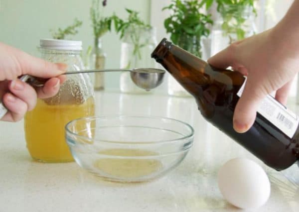 Отличный рецепт, в который входит всего 2 ингредиента — это целебный напиток и яичные желтки. Взбить одно яйцо в густую светлую пену и залить 150 мл теплого пива. Греть его сильно нельзя, иначе желток свернется при смешивании. Обработать полученным средством корни, длину и кончики. Обернуть шевелюру пищевой пленкой и полотенцем, лицо и глаза можно защитить тканевой повязкой.