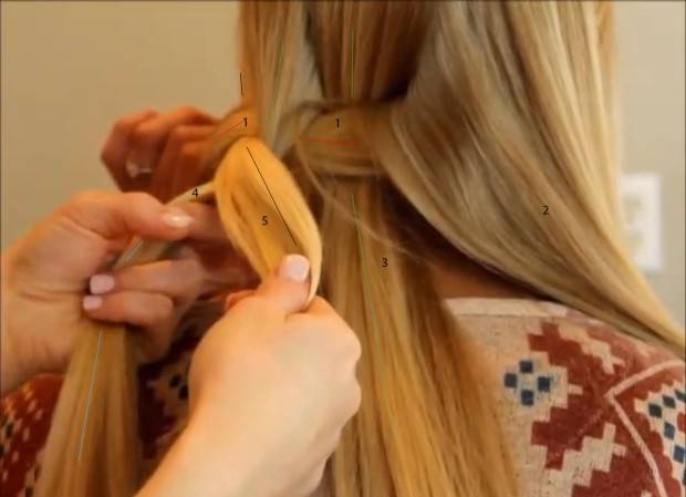 - Берется немножко волос справа и добавляется к пряди 4, которая проводится под прядь 1 и над прядью 2. Берется дополнительная прядь и соединяется с прядью 4, которая заводится под прядь 1 и над прядью 2.