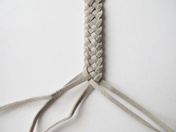 - Далее, четверную секцию положить поверх третьей и продеть под вторую. Для упрощения работы необходимо придерживаться такого порядка: сперва крайнюю часть слева продевать между двумя ближними частями, а затем делать то же самое с правой крайней частью.
