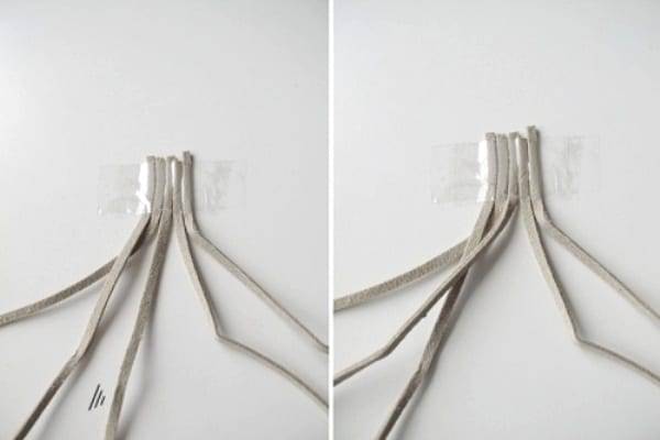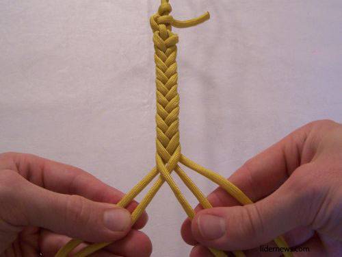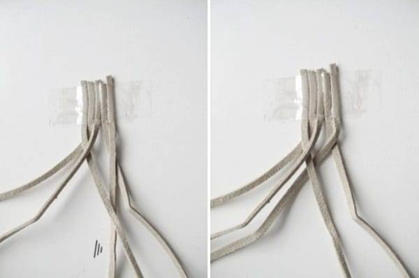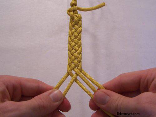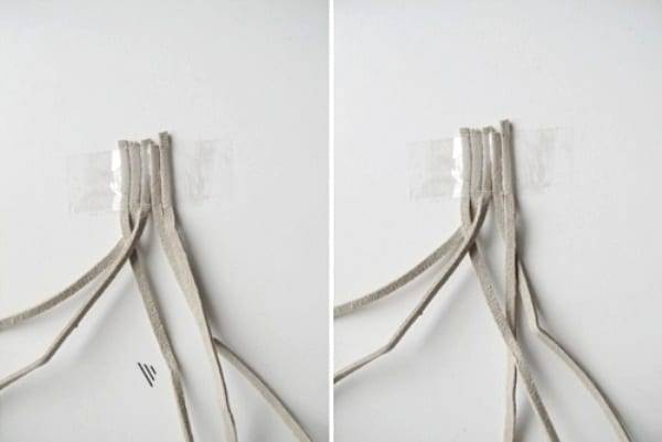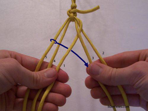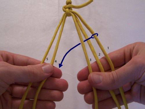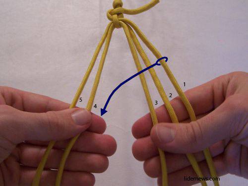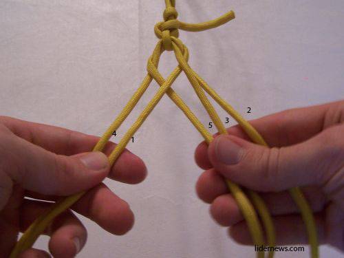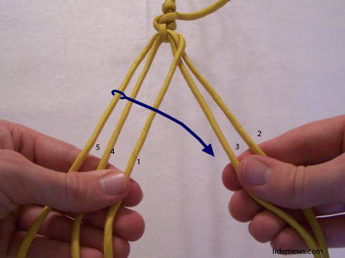 - Правой рукой протягивается прядь 5 под прядь 4 над прядью 1. Последовательность прядок следующая: 2 – 3 – 5 — 1 – 4. прядь 5 под прядь 4 над прядью 1. Последовательность опять 2 – 3 – 5 — 1 – 4.