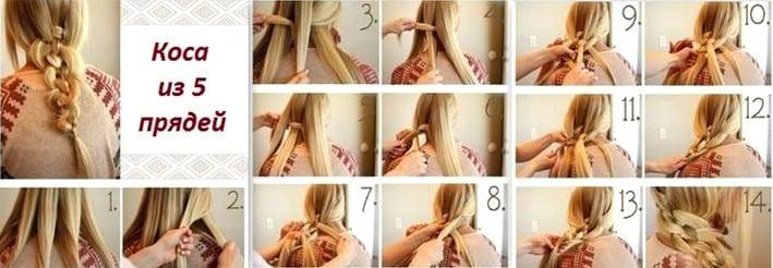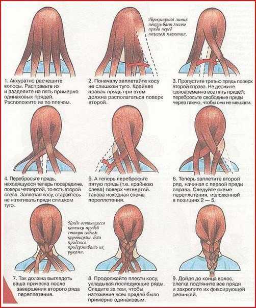 На фото: пошаговая инструкция по плетению косы из 5 прядей