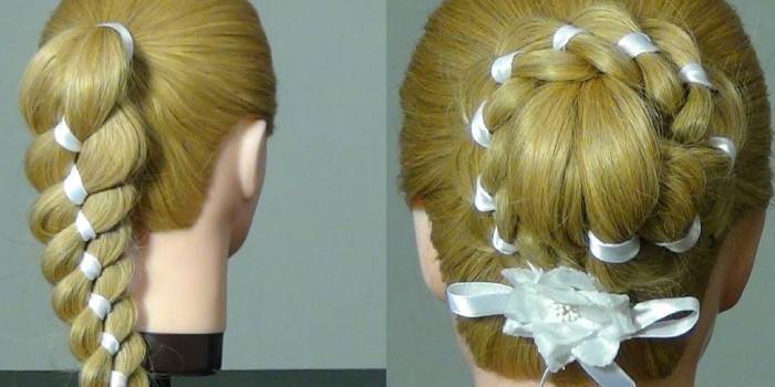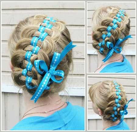 Прическа, задекорированная лентами, заколками, цепочками и другими украшениями хорошо подойдет к вечернему наряду.