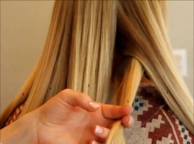 - Дальше слева берется дополнительная прядка волос и добавляется к прядке 2, протягивается под прядь 3 и над прядью 5. Пряди идут в такой последовательности: 3 – 5 -2 — 1 – 4. Берется дополнительная прядь и соединяется с прядью 2, протягивается под прядь 3 и над прядью 5.