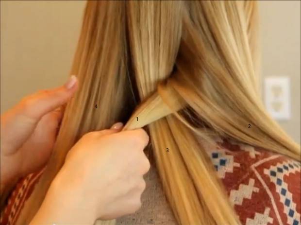 - Взять четвертую секцию и протянуть ее под первую, расположенную в центре. Во время работы необходимо крепко держать волосы, чтобы коса не выскальзывала из рук.