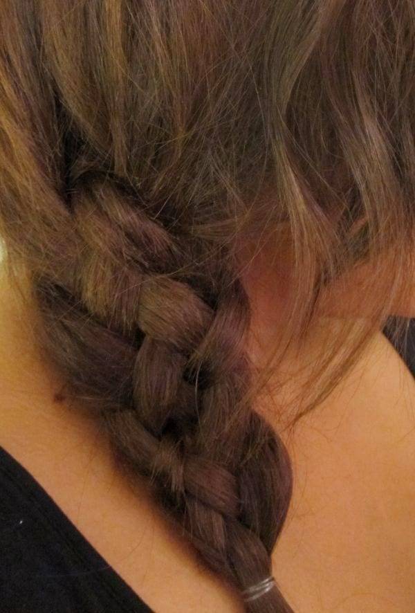 Способом плетения вывернутой косы завершаем плетение, пропуская крайние пряди под соседней и над средней, а потом фиксируем кончики резинкой.