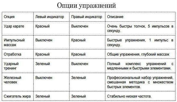 | Импульсный массаж | Выключен | Красный | Быстрые упражнения, 1 импульс в секунду. |