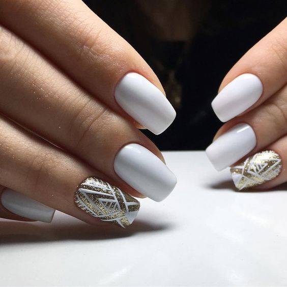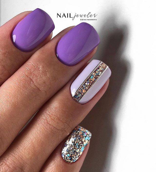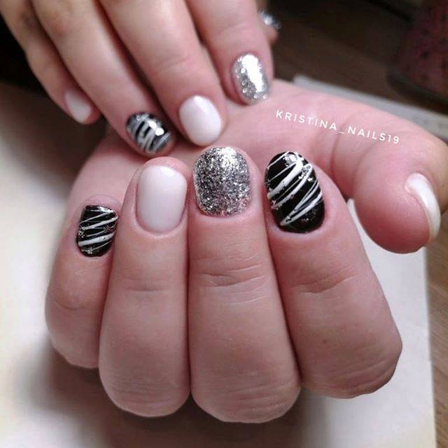При этом, абсолютно любой тип геометрии замечательно сочетается с блестящими аксессуарами. Так, фольгированные элементы в виде полосок прекрасно заменяют краски. А тонкие линии границ и заливка фигур, нанесенные глиттером, превращают обыденный дизайн в изумительно-прекрасное произведение искусства.