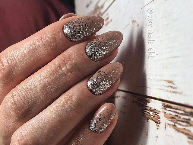 Техника омбре также имеет огромное количество примеров, когда именно блестки выполняют градиентный переход вертикально, горизонтально, угловым способом.