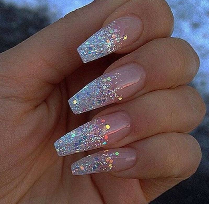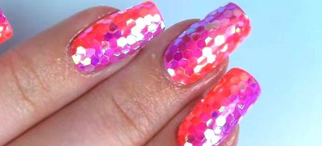 Сегодня в моде мерцающий дизайн ногтей и сочетание сразу нескольких техник маникюра. Новинкой в ногтевом дизайне стало покрытие, выполненное в популярной технике омбре (амбре) и декорированное «сухим» прозрачным глиттером в форме шестигранника. Выполнение такого «блестящего» маникюра достаточно трудоемко, может занять не один час. Однако результат стоит того! Обычно такой маникюр с блестками подразумевает покрытие всех ноготков, но если время ограничено, используйте глиттер частично.
