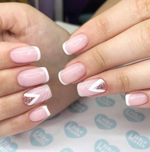 Для визуального смягчения угловатости ноготков рекомендуется выполнять дизайн в техниках френча и лунного маникюра с глиттером. Дополнительно французский нейл-арт часто украшают диагонально ориентированными элементами.
