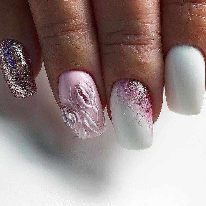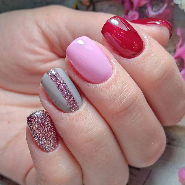 Их используют для рисунков и геометрии, выбирают одинаковый тон с гель-лаком или смешивают разные цвета. Глиттеры разного рода делают маникюр уникальным, помогают сэкономить на количестве цветников, продлевают период ношения дизайнов. Но последнее реально при условии, что сияющие частицы нигде не торчат, не цепляются за предметы при движении.