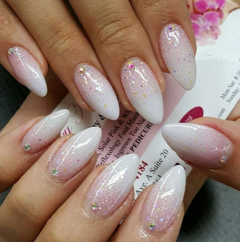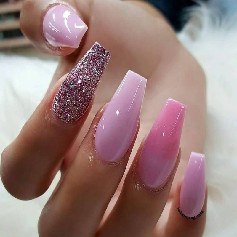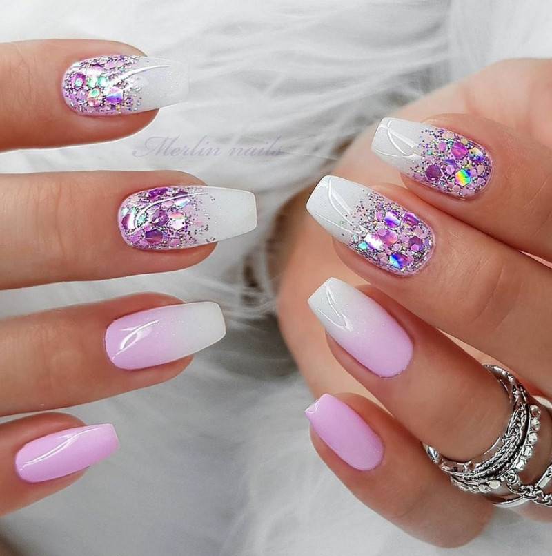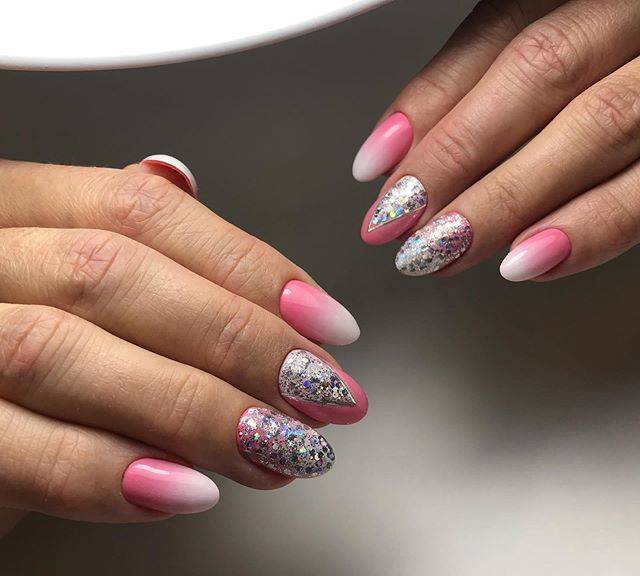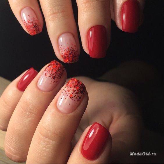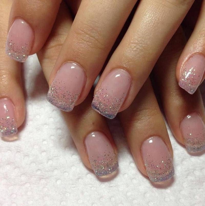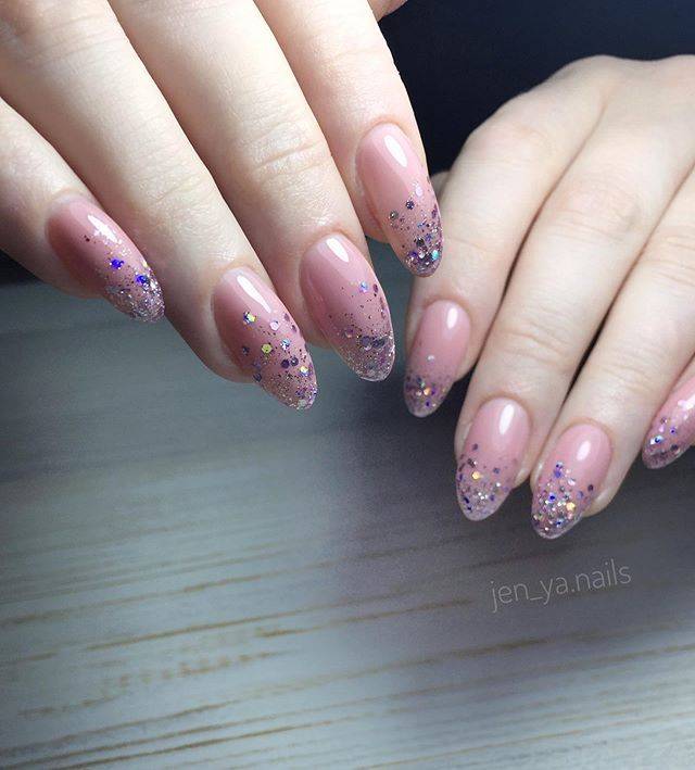 Градиент на ногтях можно выполнить двумя способами: нанести прозрачные блестки на цветное покрытие либо использовать цветной глиттер. Варианты маникюра с глиттером смотрите на фото.