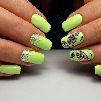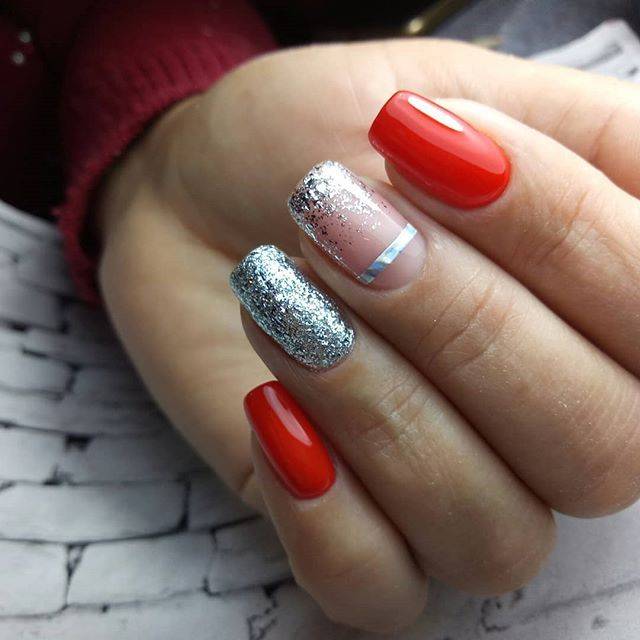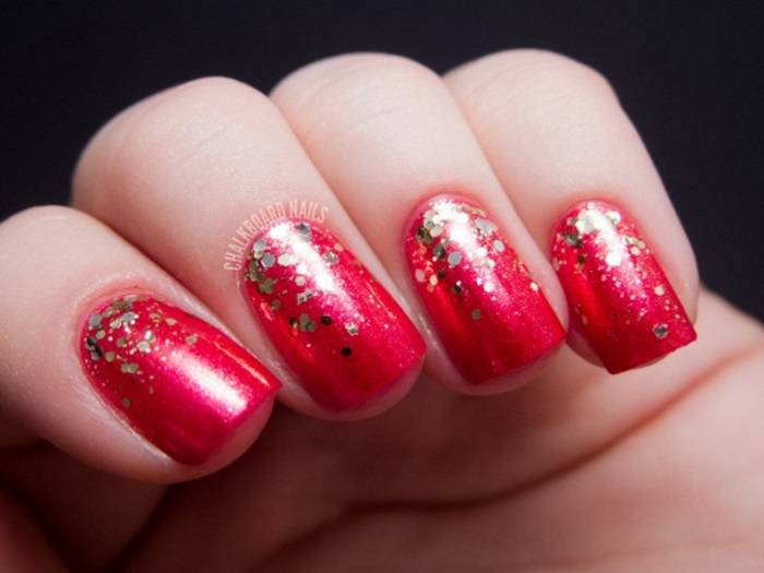 Торжественный nail-art предлагает попробовать наносить на ногти яркие сочные цвета лака с глиттером. Блестящее покрытие гармонирует с матовым, поэтому выбирают для праздника больше сияющих средств. Рекомендуют выложить рисунок из стразов на одном или двух ноготках, скромнее смотрится слой глиттерной пудры.
