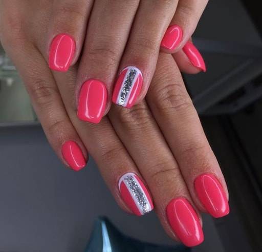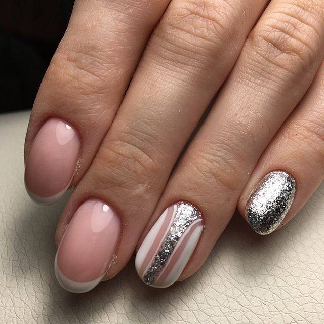 На короткие ногти лучше сделать максимально простой маникюр без излишнего декорирования. Хорошее решение – использовать глянец и блестящие элементы в виде продольных полосок.