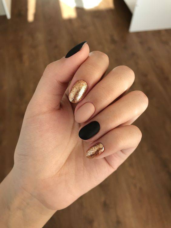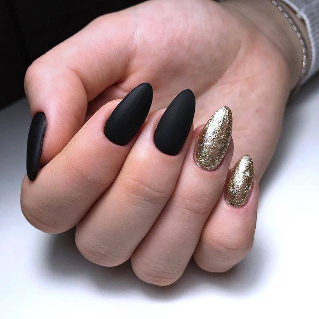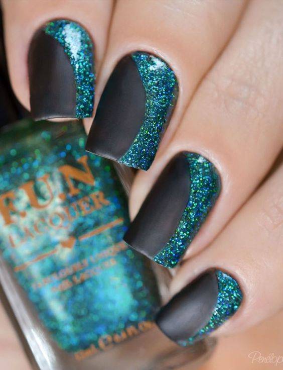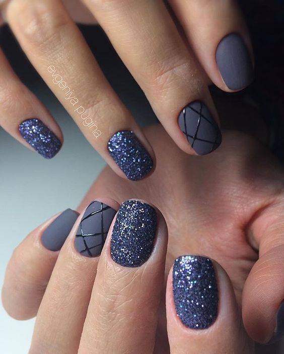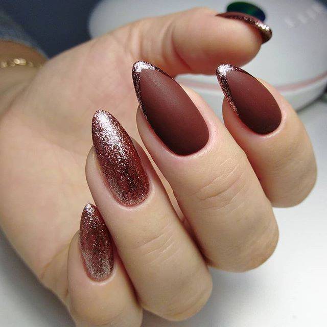 Матовый маникюр с глиттером выглядит изысканно и элегантно, поэтому его выбирают женщины, которые хотят поразить шикарностью образа.